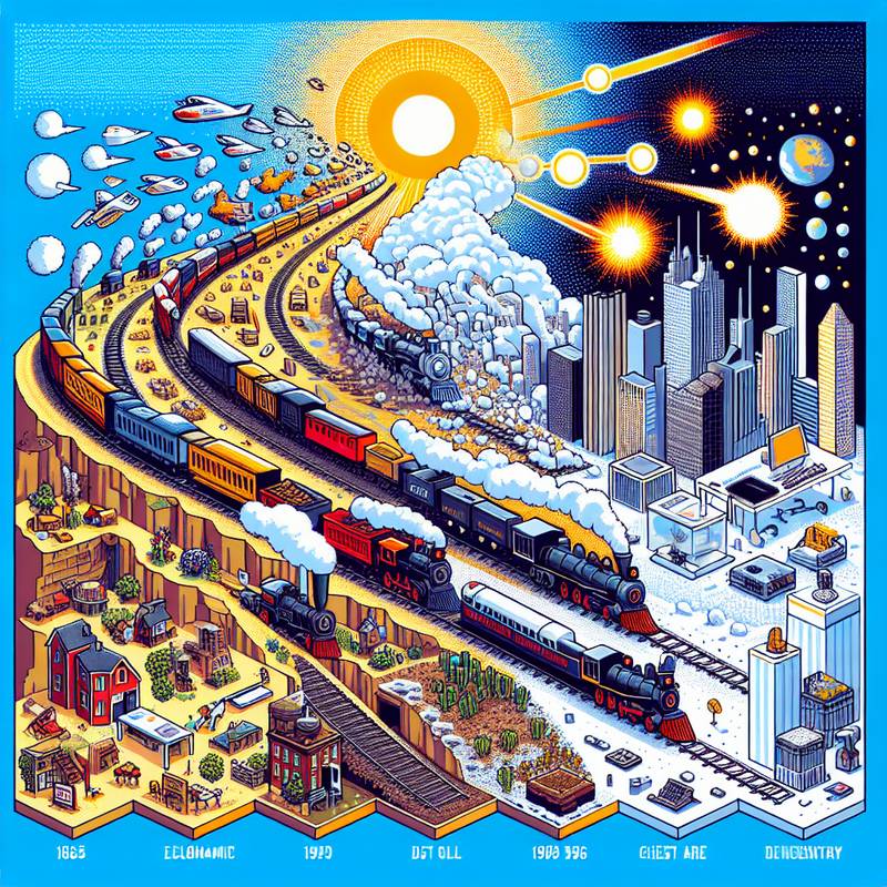 The engine begins in soot and steam, 1865: postbellum America, fractured but forging. Steel sinews stretch across continents, railroads birthed from ambition and genocide, threading manifest destiny through plains and peaks. An industrial hydra yawns—its breath heavy with coal, its mouth feeding upon immigrant dreams.